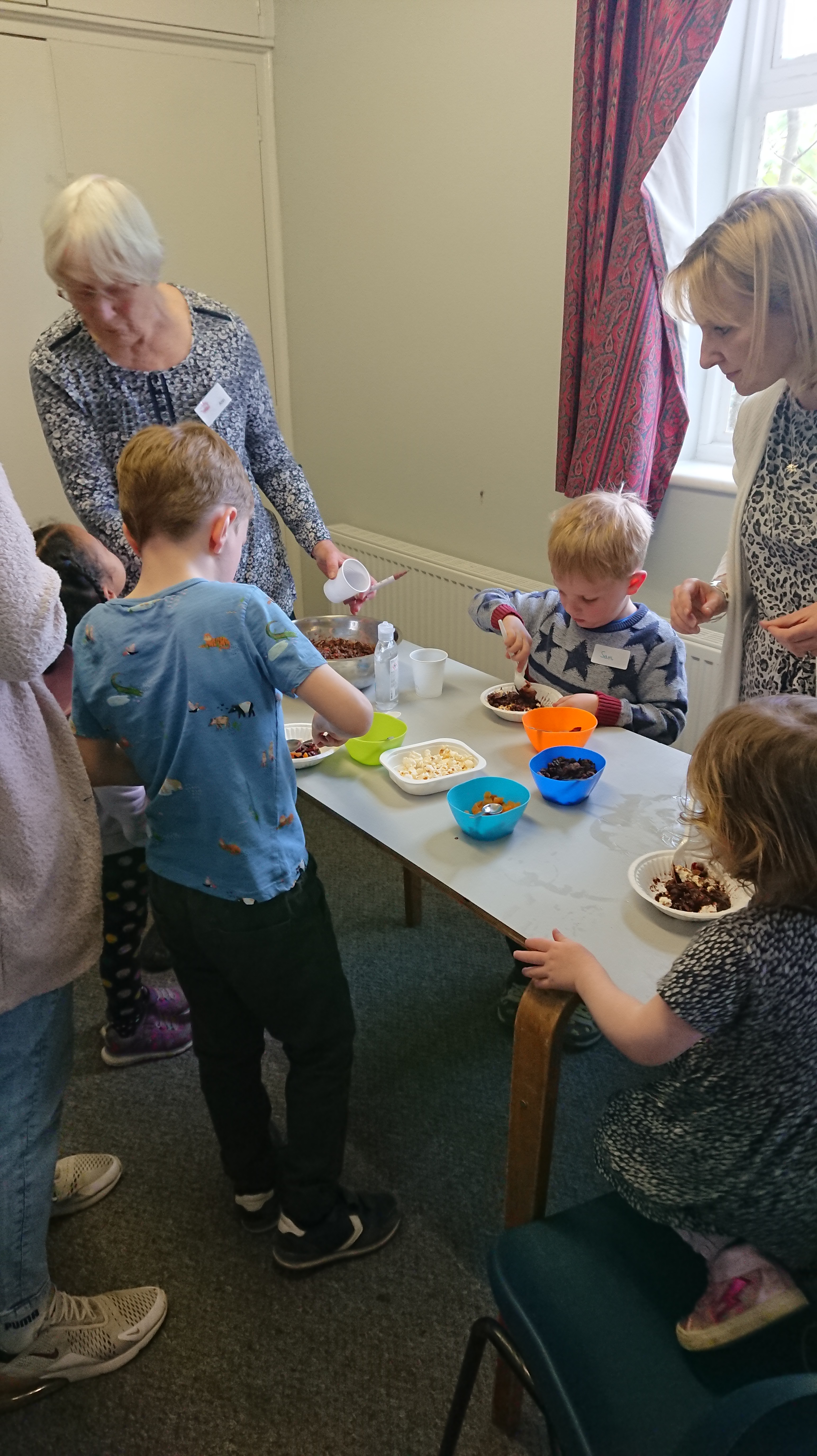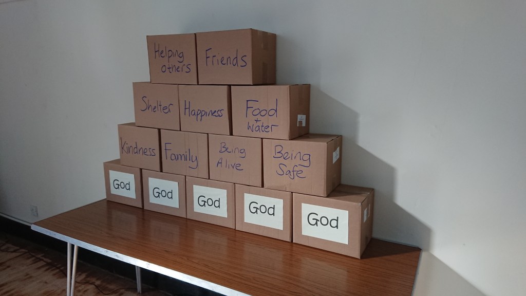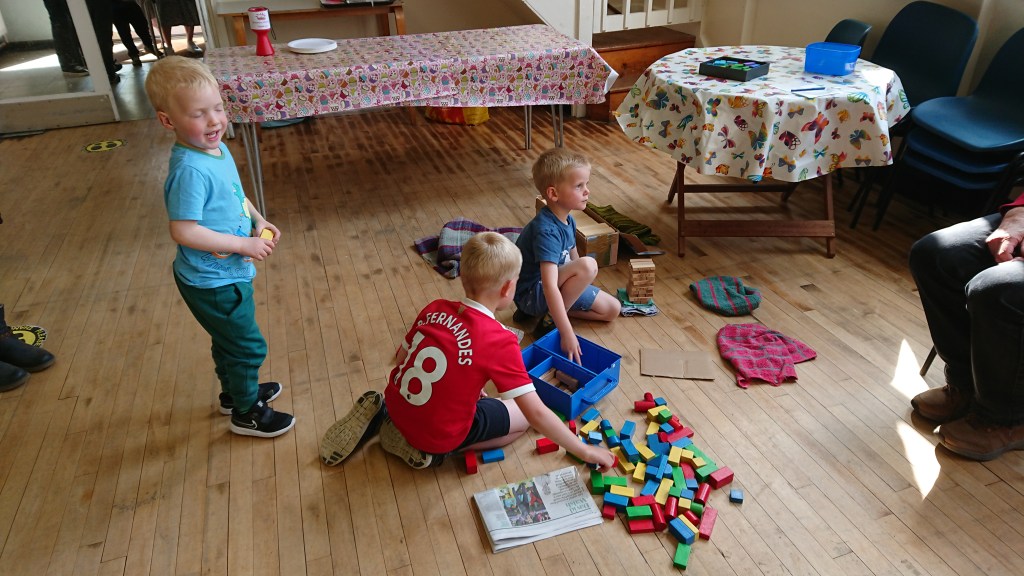 There were lots of craft activities based round the theme, of which making cakes with melted chocolate and cornflakes was definitely the most popular. Other activities included decorating stones, building straw houses, using building bricks, building on sand, drawing and playdough. The celebration time included building a wall from boxes decorated with words such as being safe, helping others, kindness, with God as the foundation.