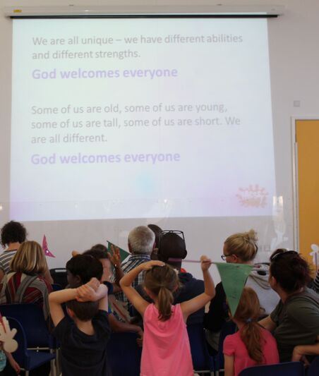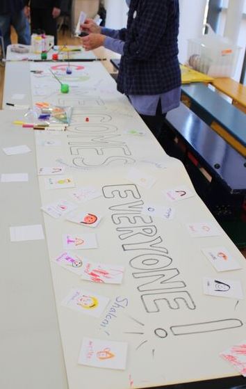 The activities all fed into the theme for the day God Welcomes Everyone. For example, by weaving one large piece of material with a mixture of wool and fabric, each person’s contribution, whatever their age, whatever their ability, were all added together to make one whole.